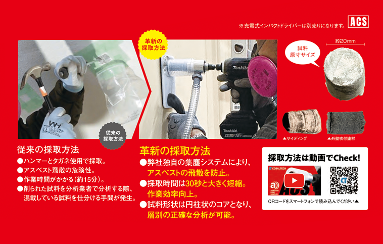 アスベストの事前調査で行う試料採取が、インパクトドライバーで約30秒で可能です。(1サンプル)